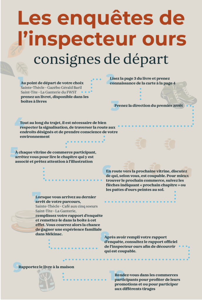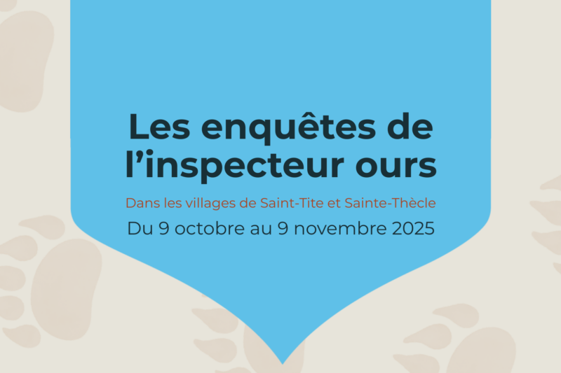 À partir du 9 octobre, prenez part aux enquêtes captivantes à Saint-Tite ou à Sainte-Thècle! Chaque vitrine de commerce se transforme en indice, et votre mission est de suivre l’intrigue pas à pas pour résoudre l’enquête de l’inspecteur ours. Avec un livret en main, explorez les deux parcours pour y découvrir les talents de nos artistes locaux et le dynamisme de nos cœurs villageois, tout en vivant un vrai jeu d’investigation.